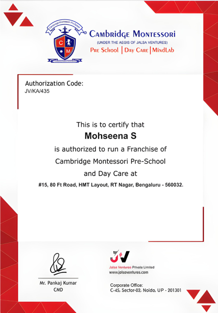 We at Cambridge Montessori Pre School are always available to help you regarding your doubts or enquiry. You can contact us via email,call or visit our 80ft road, HMT Layout, RT Nagar school.